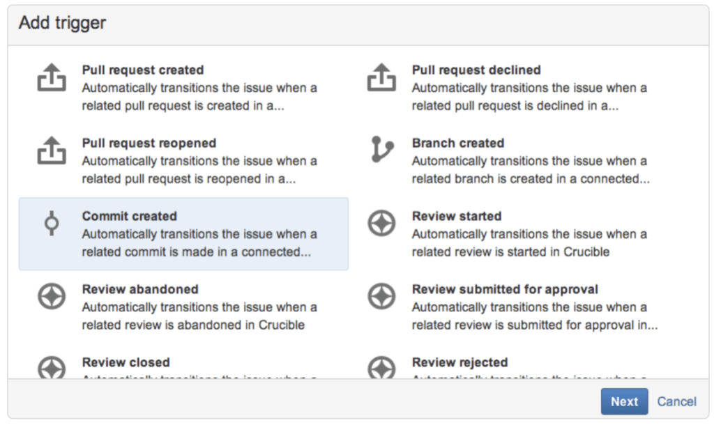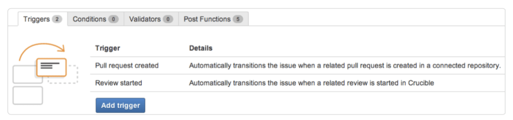 What can I set? Triggers can be configured in Jira workflows so that they react to events in linked developer tools and automatically trigger a transition based on this.