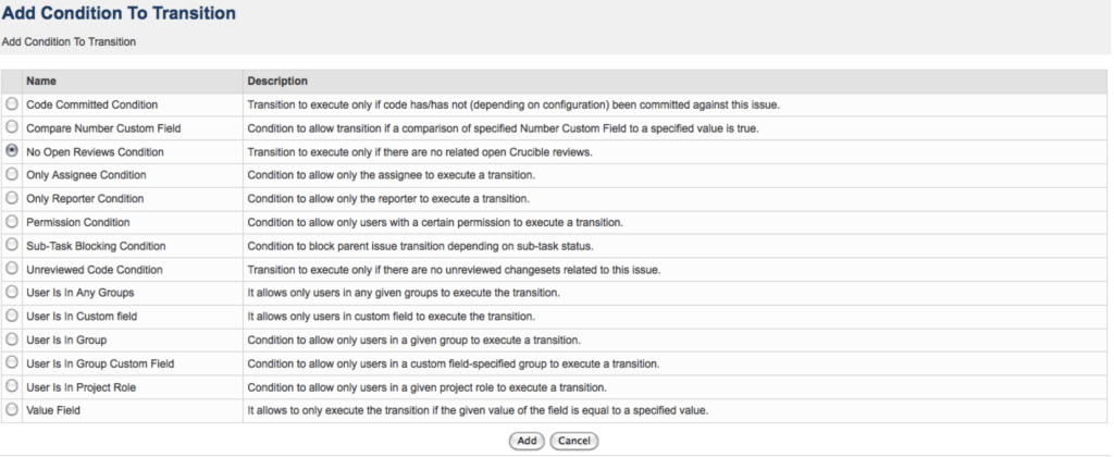 For example, you can restrict for which users in the project a certain transition should be visible and therefore possible (e.g. only for assignees or reporters). Another restriction would be that a certain issue field must correspond to a predefined value for the transition to be visible as an option for a ticket.