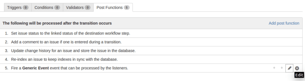 Please note that each Jira transition already has 5 basic post functions that cannot be changed, reordered or deleted.