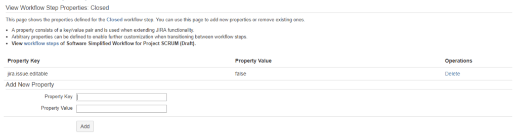Was kann ich einstellen: Mithilfe der Properties können bestimmte Issue-Eigenschaften abhängig von Transition oder Status-Erreichung geändert werden. Z. B. kann die Anzahl der auswählbaren Optionen für das Resolution-Feld im Transition-Screen eingeschränkt werden. Darüber hinaus kann die Reihenfolge der Transition-Buttons angepasst werden oder der Edit-Button für ein Issue vollständig entfernt werden, sobald es einen bestimmten Status erreicht hat (jira.issue.editable = false).