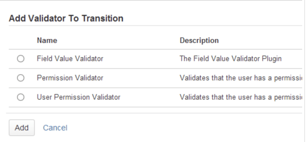 ! Ohne weitere Jira-Add-on oder Plugins sind standardmäßig nur der „Permission Validator“ und der „User Permission Validator“ verfügbar. !