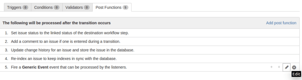 Zu beachten ist, dass jede Jira-Transition bereits 5 grundlegende Post Functions hat, die nicht verändert, neu geordnet oder gelöscht werden können.